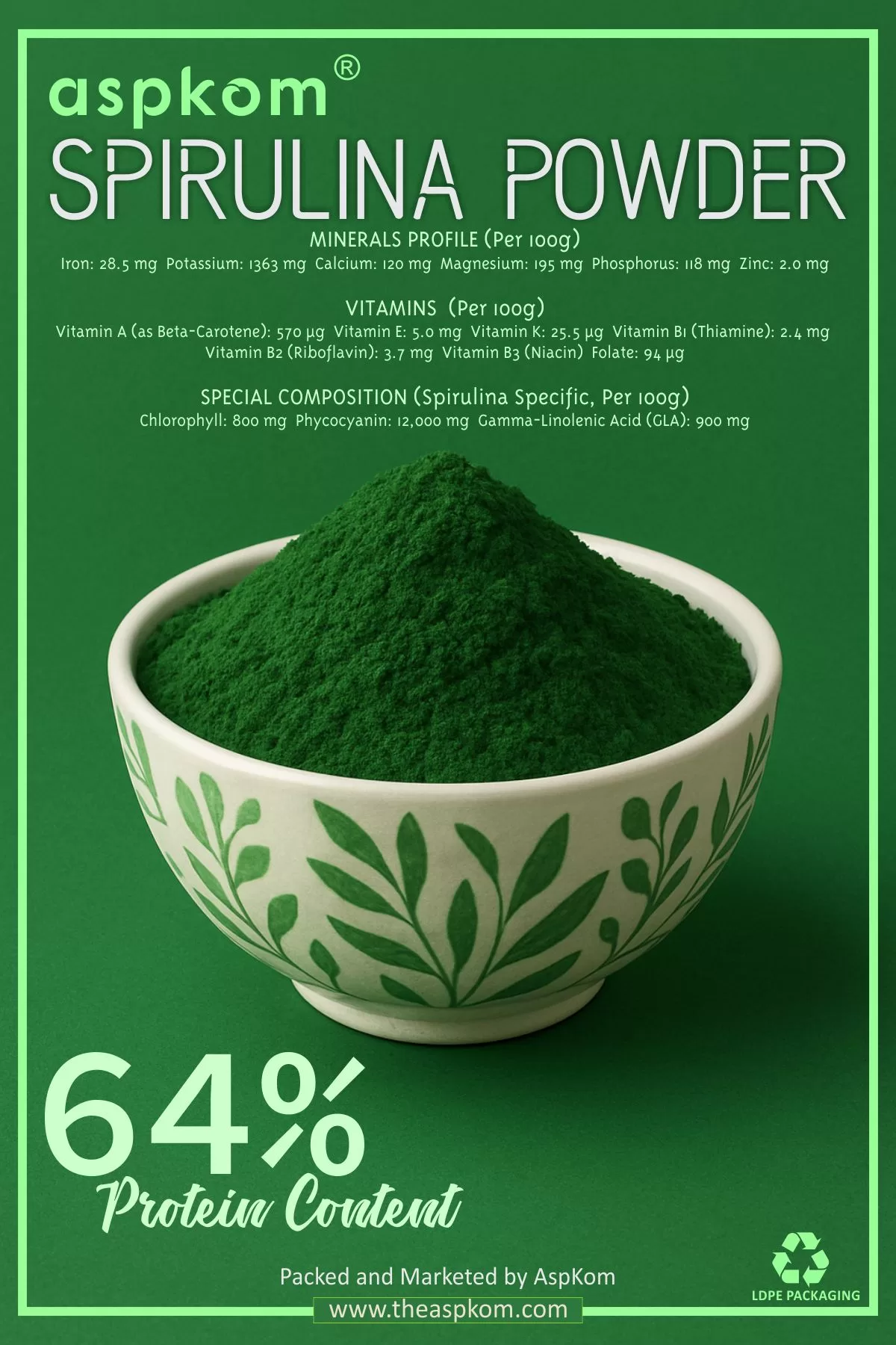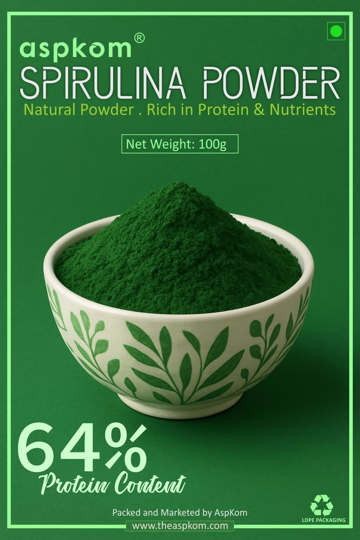 Unlock the power of nature with aspKom’s Organic Spirulina Powder, a definitive herbal superfood revered for its exceptional nutritional profile. This 100g pack contains one of nature’s most potent sources of sustainable, plant-based nutrition, boasting a remarkable 64% protein content by weight. It is meticulously sourced from certified organic aqua farms, ensuring a product that is pure, potent, and free from pesticides, heavy metals, and contaminants. Its vibrant dark green color is a direct indicator of its high chlorophyll and phytonutrient density, making it an ideal daily supplement for health-conscious individuals, athletes, vegans, and families seeking to fortify their diet with clean, green energy.